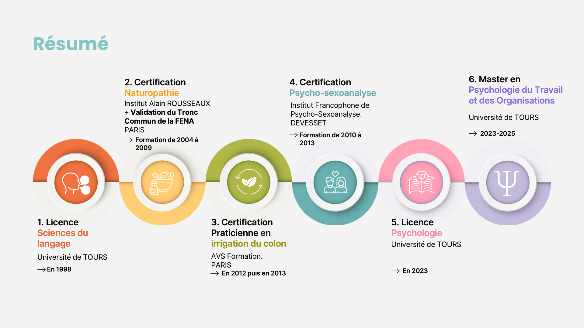 En parallèle d’un travail personnel engagé depuis plus de 30 ans (en psychanalyse, psychothérapie, EMDR et hypnose) j’ai progressivement développé une approche intégrative, mêlant l'expérience vécue et les formations impliquantes. Après une vie professionnelle artistique, j’ai poursuivi avec une formation en naturopathie pendant 4 ans auprès d’Alain Rousseaux (aujourd’hui ISUPNAT), validée par le tronc commun de la FENA (Fédération Française des Écoles de Naturopathie). Cette approche globale m’a permis de poser les bases d’une compréhension fine du corps, de l’énergie vitale, et de l’équilibre de vie. J’ai poursuivi avec une spécialisation en psychosexoanalyse, au sein de l’Institut Francophone de Psychosexoanalyse, fondé et dirigé par Michel Bonhomme, auteur de "Se réjouir en couple" (Éditions Dangles). Cette approche d’orientation gestaltiste et analytique m’a offert une écoute plus subtile des enjeux affectifs, relationnels et intimes. En 2014, j’ai rencontré Arouna Lipschitz et découvert son enseignement sur la voie de l’Amoureux, qui a été et est toujours pour moi une véritable révolution intérieure. Cette rencontre a eu des effets tant dans ma vie personnelle et professionnelle. J’étudie et intègre les concepts arouniens dans ma pratique, tels que la nostalgie de l’ailleurs, l’Arbre des valeurs, le développement relationnel et bien d’autres encore. C’est grâce à son enseignement que j’ai été inspirée pour créer les parcours de stages Roi-Reine et La Suite, ainsi que l’atelier des valeurs. Pendant 14 ans, j’ai accompagné de nombreuses personnes dans leur cheminement personnel. Grâce aux cabinets Goût Nature et Le Goût des Cerises, spécialisés dans le bien-être et le développement personnel, j’ai pu mettre mes compétences au service de celles et ceux en quête d’équilibre et d’épanouissement. En 2021, portée par le besoin de me remettre en question, l’envie d’approfondir mes compétences et de les mettre au service du monde du travail, j’ai repris mes études pour devenir psychologue du travail et des organisations. Mon souhait : relier mes expériences à une pensée plus structurée et scientifique, afin de pouvoir accompagner aussi bien les dynamiques individuelles que les enjeux collectifs au sein des entreprises.